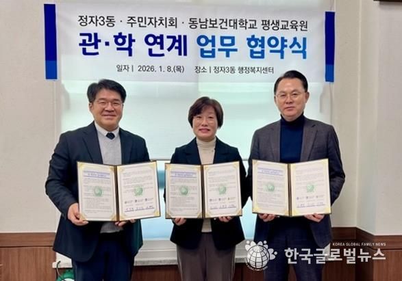 (한국글로벌뉴스 - 박소연 기자) 수원시 장안구 정자3동 행정복지센터와 주민자치회는 지역 내 협력 기반을 구축해 주민 맞춤형 프로그램을 확대하고자 지난 8일 동남보건대학교 평생교육원과 업무협약을 체결했다.