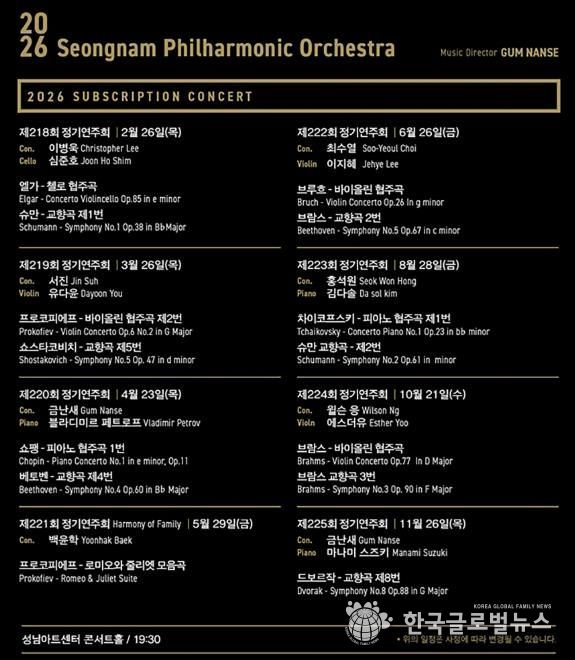 (한국글로벌뉴스 - 박소연 기자) 2026년 창단 23주년을 맞는 성남시립교향악단은 해마다 다양한 연주자와 수준높은 프로그램으로 끊임없이 매진 행렬을 이어가고 있다.