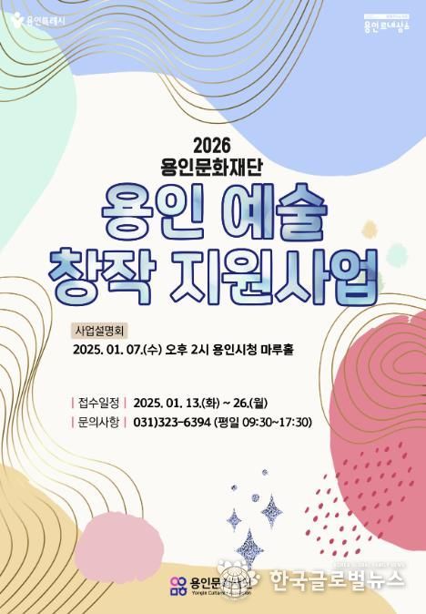 (한국글로벌뉴스 - 박소연 기자) 용인문화재단은 기존'문화 예술 공모 지원사업'을 전면 개편하고, 사업명을 ‘2026 용인 예술 창작 지원’으로 변경해 새롭게 전환한다고 밝혔다. 이번 사업은 지난 6일 공고됐으며, 1월 13일부터 26일까지 접수를 통해 총 6억 400만 원의 지원금을 사업 유형과 규모에 따라 차등 지원할 예정이다.