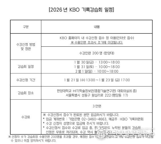 (한국글로벌뉴스 - 박지형 기자) 2026년 KBO 기록강습회가 1월 30일(금)부터 2월 1일(일)까지 서울 한양대학교에서 개최된다. 기록강습회는 야구 공식기록법의 보급과 이해를 통한 저변 확대를 목적으로 프로야구 원년인 1982년부터 개최됐다.