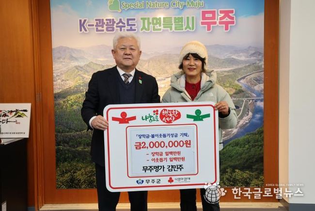 (한국글로벌뉴스 - 박소연 기자) 무주군 무주읍에 위치한 한식 전문점 ‘무주명가’의 김민주 사장이 지난 14일 무주군에 이웃돕기 성금 1백만 원, (재)무주군교육발전장학재단에 장학금 1백만 원 등 총 2백만 원을 기탁했다.