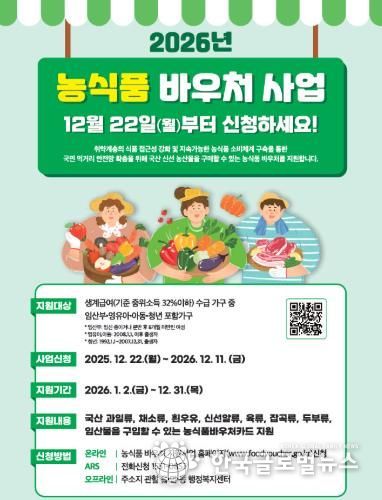 박은석 무주군농업기술센터 농촌활력과장은 "농식품 바우처는 취약 계층 군민들이 신선하고 균형 잡힌 농식품을 섭취할 수 있도록 뒷받침하는 정책“이라며 ”소급 지원이 되지 않는 만큼 대상 가구들이 꼭 신청해서 혜택을 누릴 수 있도록 홍보에도 최선을 다할 것“이라고 밝혔다.