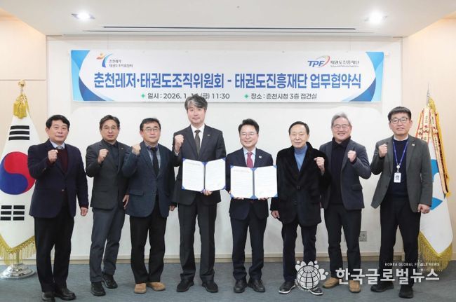 (한국글로벌뉴스 - 박지형 기자) 춘천레저·태권도조직위원회(위원장 육동한)와 태권도진흥재단(이사장 김중헌)이 16일 태권도 발전과 국제 경쟁력 강화를 위해 손을 맞잡았다.