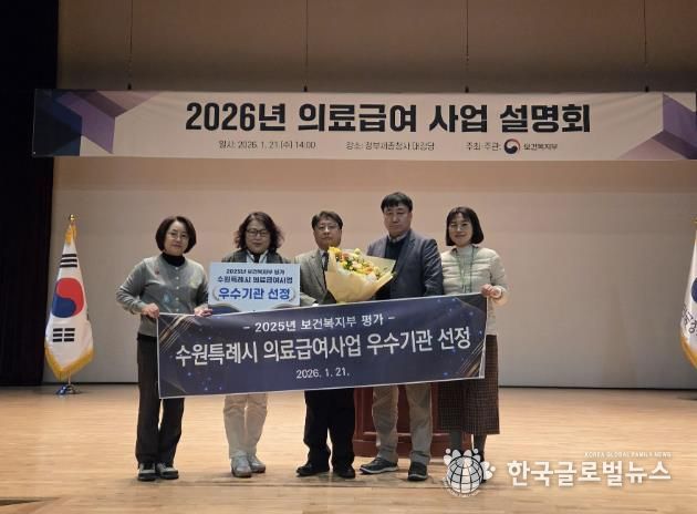 (한국글로벌뉴스 - 박소연 기자) 수원특례시는 보건복지부가 주관한 ‘2025년 의료급여사업 평가’에서 우수 기관으로 선정돼 표창을 받았다. 시상식은 21일 정부세종청사 대강당에서 열린 ‘2026년 의료급여 사업 설명회’ 중 진행됐다.