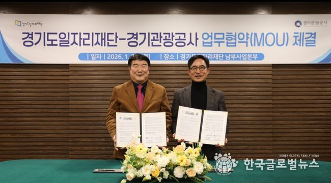 (한국글로벌뉴스 - 박소연 기자) 경기도일자리재단과 경기관광공사는 22일 경기도일자리재단 남부사업본부에서 ‘경기북부 관광 활성화 및 유연근무 확산을 위한 업무협약(MOU)’을 체결했다.