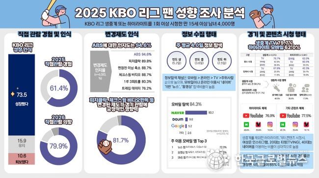 (한국글로벌뉴스 - 박지형 기자) KBO는 2025 KBO 리그에 대한 팬 인식과 소비 행태를 분석하기 위해 전문 조사업체인 ㈜글로벌리서치를 통해 온라인 팬 성향 조사를 실시했다. 본 조사는 KBO 리그 생중계 또는 하이라이트를 1회 이상 시청한 만 15세 이상 남녀 4,000명을 대상으로 진행됐다.