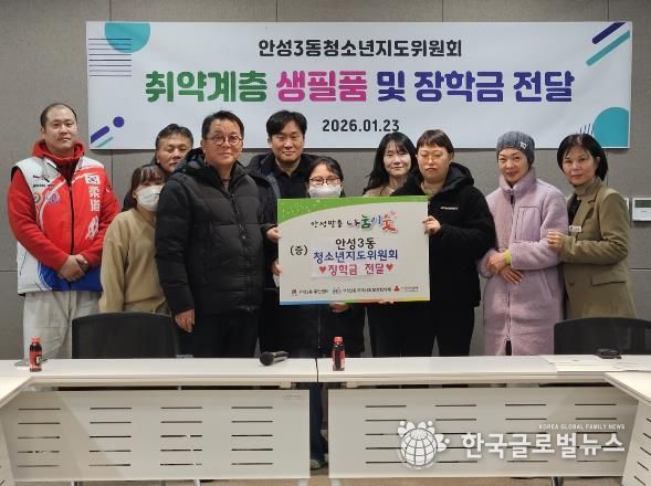 (한국글로벌뉴스 - 박소연 기자) 안성3동 청소년지도위원회는 지난 1월 23일 지역 내 취약계층 청소년을 대상으로 장학금과 생필품을 전달하며 따뜻한 나눔을 실천했다.