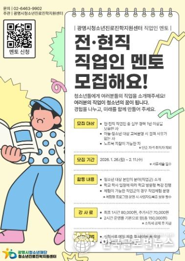 (한국글로벌뉴스 - 박소연 기자) 광명시청소년재단 청소년진로진학지원센터는 관내 청소년들에게 현실적인 직업 정보와 체계적인 진로 설계 기회를 제공하기 위해 ‘2026년 직업인 멘토’를 신규 모집한다고 밝혔다.