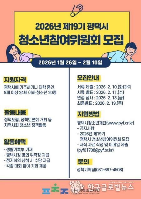 (한국글로벌뉴스 - 박소연 기자) 평택시와 평택시청소년재단은 청소년 정책 참여 기회를 확대하고 자치 역량을 강화하기 위한 2026년 제19기 청소년참여위원회 위원 20명을 공개 모집한다고 밝혔다.