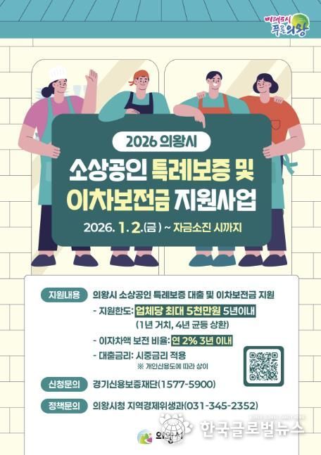 (한국글로벌뉴스 - 박소연 기자) 의왕시가 관내 소상공인의 경영난을 완화를 위해 ‘2026년 소상공인 특례보증 및 이차보전금 지원사업’을 추진하고 있다.