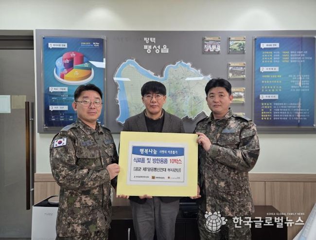(한국글로벌뉴스 - 박소연 기자) 공군 제7항공통신전대 부사관단은 지난 28일 지역 내 어려운 이웃을 돕기 위해 식료품과 방한용품 10박스 및 상품권(100만 원)을 평택시 팽성읍 행정복지센터에 전달하며 따뜻한 나눔을 실천했다.