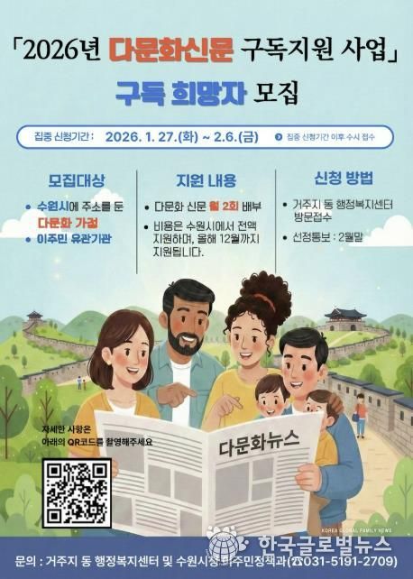 (한국글로벌뉴스 - 박소연 기자) 수원특례시가 다문화가족의 한국 생활 적응을 돕기 위해 ‘다문화신문 구독 지원 사업’ 대상자를 모집한다.
