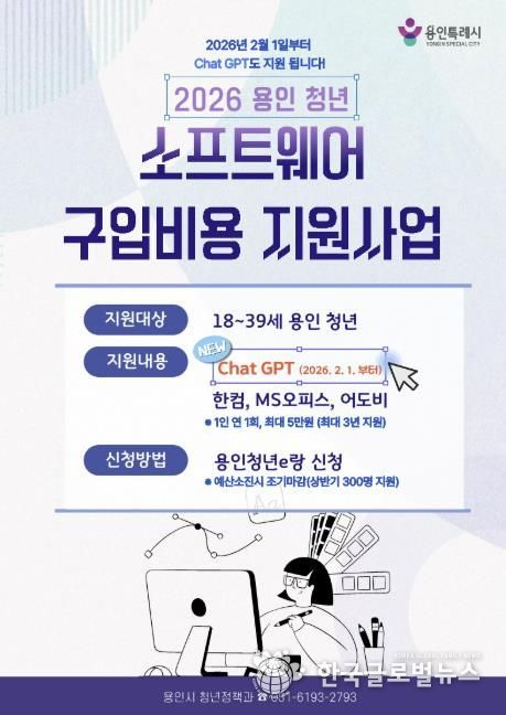 (한국글로벌뉴스 - 박소연 기자) 용인특례시는 청년들의 디지털 역량 강화를 위해 ‘청년 소프트웨어 구입비용 지원사업’ 대상 품목에 ‘ChatGPT Plus’를 추가했다고 2일 밝혔다.