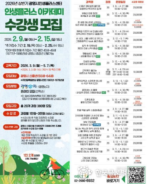 (한국글로벌뉴스 - 박소연 기자) 광명시 인생플러스센터는 신중년의 인생 2막 탐색과 준비를 지원하는 ‘2026년 상반기 인생플러스 아카데미’ 수강생 380명을 오는 9일부터 선착순 모집한다.
