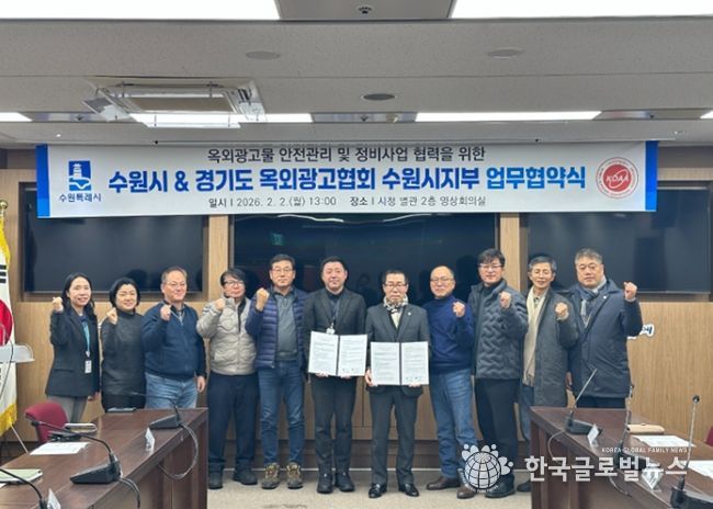 (한국글로벌뉴스 - 박소연 기자) 수원특례시와 경기도 옥외광고협회 수원시지부가 2일 시청 영상회의실에서 ‘옥외광고물 안전관리 강화를 위한 업무협약’을 체결하고, 협력을 약속했다.