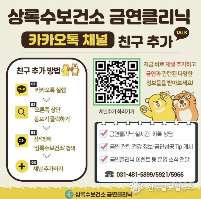 (한국글로벌뉴스 - 박소연 기자) 안산시 상록수보건소는 흡연자의 금연 성공을 체계적으로 지원하기 위해 ‘금연클리닉 카카오톡 채널’을 개설해 운영한다고 3일 밝혔다.