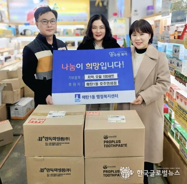 (한국글로벌뉴스 - 박소연 기자) 영통구 매탄1동 행정복지센터는 지난 3일 호주면세점직영할인점 매탄점이 설 명절을 맞이해 매탄1동 행정복지센터에 프로폴리스 치약 100개, 오일 관절크림 100개를 후원했다고 밝혔다.