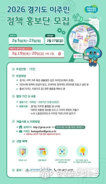 (한국글로벌뉴스 - 박소연 기자) 경기도이민사회통합지원센터에서 오는 23일까지 ‘2026 경기도 이주민 정책 홍보단’ 15명을 모집한다.