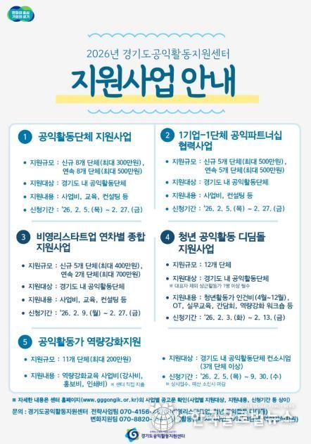 (한국글로벌뉴스 - 박소연 기자) 경기도공익활동지원센터가 ‘2026년 경기도 공익활동 지원사업’에 참여할 도내 공익활동 단체를 모집한다.