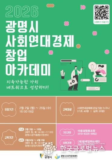 (한국글로벌뉴스 - 박소연 기자) 광명시가 ‘2026년 광명시 사회연대경제 창업 아카데미’ 수강생을 오는 25일까지 모집한다.
