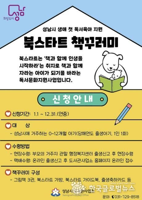(한국글로벌뉴스 - 박소연 기자) 성남시는 올해 출생아 가정을 대상으로 ‘북스타트(Book Start) 책 꾸러미 지원사업’을 시행한다고 6일 밝혔다.