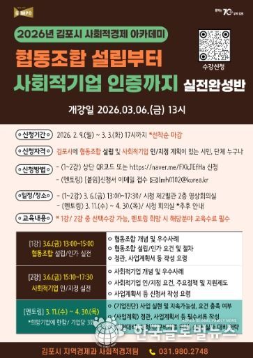 (한국글로벌뉴스 - 박종욱 기자) 김포시가 사회문제 해결을 위한 참신한 아이디어와 실행력을 갖춘 사회적경제기업 육성을 위해 ‘2026년 김포시 사회적경제 아카데미’를 개설하고, 오는 3월 3일까지 수강생을 모집한다.