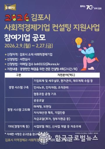 (한국글로벌뉴스 - 박종욱 기자) 김포시가 관내 사회적경제기업의 지속 가능한 성장과 자생력 강화를 위해 ‘사회적경제기업 역량강화 컨설팅 지원사업’ 참여기업을 오는 2월 27일까지 모집한다.