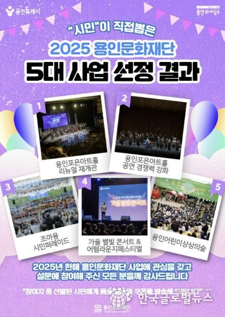 (한국글로벌뉴스 - 박소연 기자) 용인문화재단은 시민 참여 온라인 투표를 통해 ‘시민이 선정한 2025년 용인문화재단 5대 사업’을 발표했다.