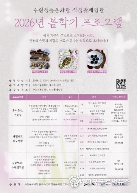 (한국글로벌뉴스 - 박소연 기자) 수원문화재단은 오는 10일부터 수원전통문화관 식생활체험관 2026년 봄학기 프로그램 참여자를 모집한다. 이번 봄학기 프로그램은 계절의 변화에 맞춘 전통 식문화와 다양한 음식을 시민들이 쉽고 재미있게 경험할 수 있도록 기획했다. 전통장 담그기부터 제철 식재료 요리, 궁중병과 체험까지 다양한 내용으로 운영한다.