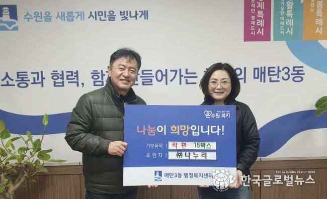(한국글로벌뉴스 - 박소연 기자) 수원시 영통구 매탄3동 행정복지센터는 지난 6일, 관내 폐기물 수거업체인 ㈜나누리로부터 설 명절을 맞아 어려운 이웃을 위한 라면 15박스를 기탁받았다고 밝혔다.