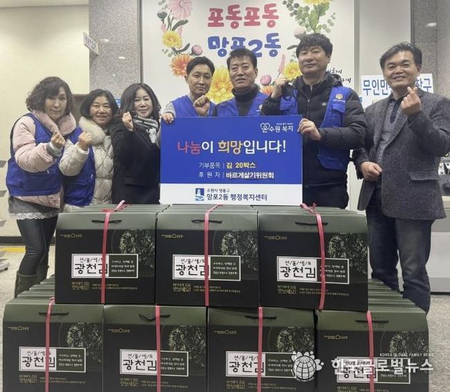 (한국글로벌뉴스 - 박소연 기자) 영통구 망포2동 행정복지센터는 지난 6일 망포2동 바르게살기위원회가 관내 저소득 가정을 지원하기 위해 김 20박스를 기탁했다고 밝혔다.
