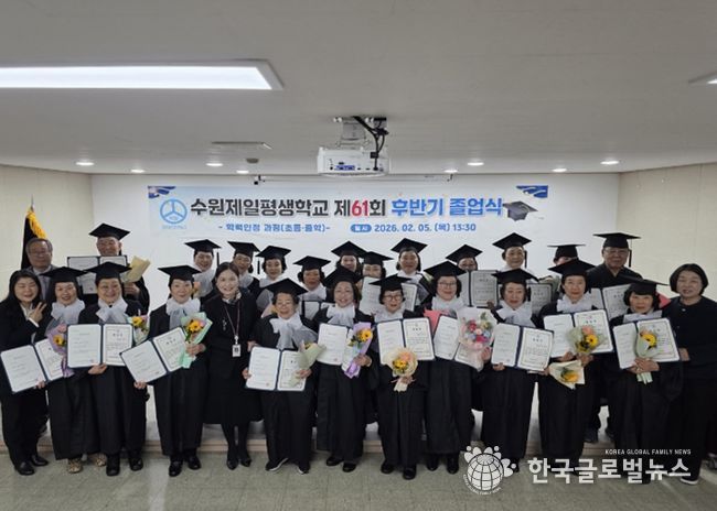 (한국글로벌뉴스 - 박소연 기자) 수원제일평생학교는 2월 5일 오후 제61회 하반기 학력인정 졸업식을 진행했다. 졸업식은 교내 난타 동아리의 축하 공연으로 시작됐으며, 경기도교육청·수원교육지원청·수원시청 관계자들이 참석해 자리를 함께했다.