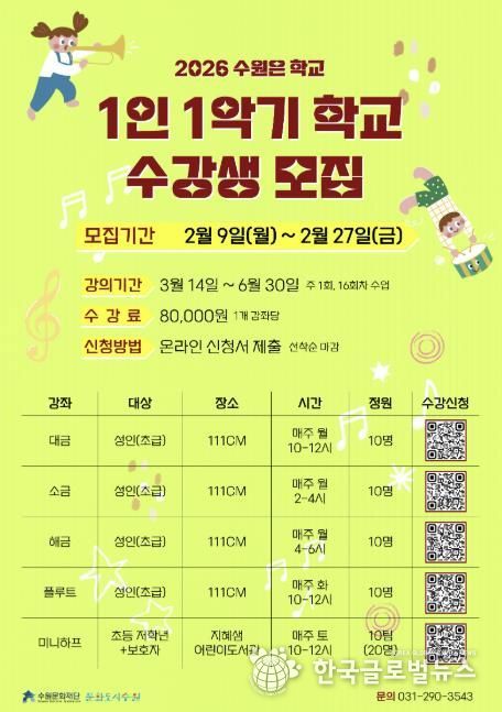 (한국글로벌뉴스 - 박소연 기자) 수원문화재단이 오는 27일까지 시민 누구나 참여할 수 있는 ‘2026 수원은학교 1인 1악기 학교’ 수강생을 선착순으로 모집한다.
