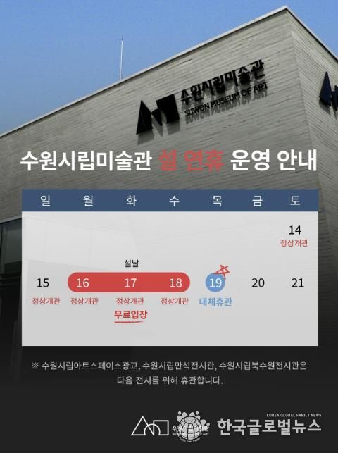 수원시립미술관 행궁 본관은 설 연휴 기간인 2월 15일부터 18일까지 정상 개방하며 설 당일인 2월 17일에는 무료 관람을 실시하며, 2월 19일에 대체 휴관한다.
