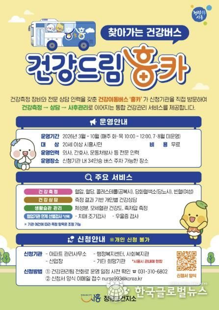 (한국글로벌뉴스 - 박소연 기자) 시흥시는 시민의 건강 증진과 일상 속 건강관리 실천을 지원하기 위해 찾아가는 건강버스 ‘건강드림 흥카’를 3월부터 10월까지 무료로 운영한다.