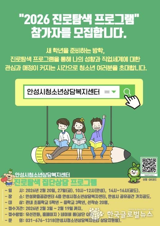 (한국글로벌뉴스 - 박소연 기자) 안성시청소년상담복지센터는 오는 2월 20일과 27일, 2일간 청소년을 대상으로 ‘겨울방학 프로그램 – 진로탐색’을 운영한다고 밝혔다.