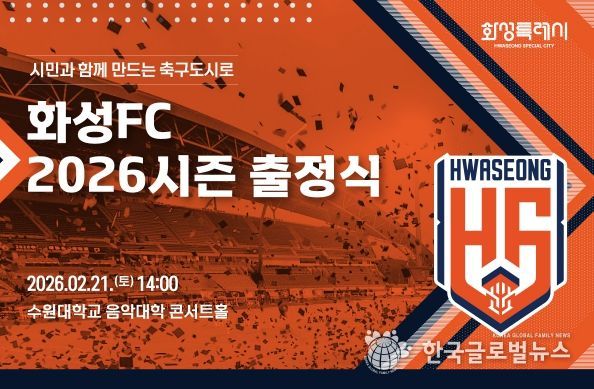(한국글로벌뉴스 - 박지형 기자) 화성FC가 오는 2월 21일 오후 2시, 수원대학교 음악대학 콘서트홀에서 ‘2026 화성FC 출정식’을 개최하고 2026시즌의 본격적인 출발을 알린다.