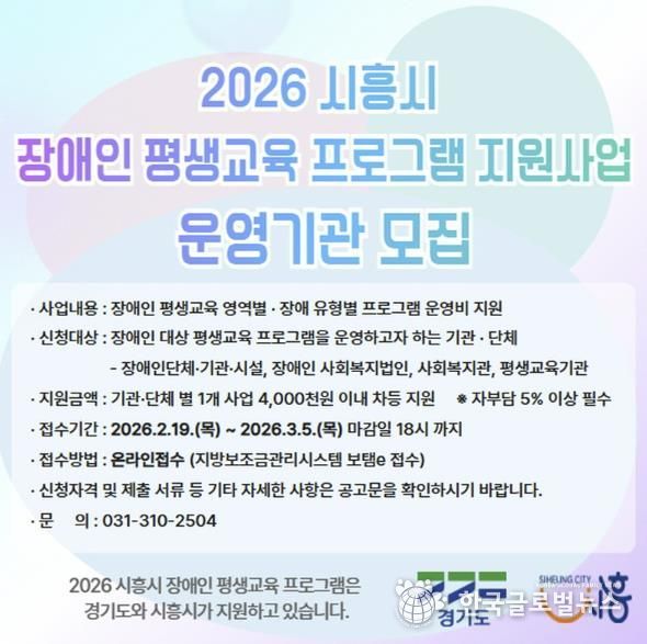 (한국글로벌뉴스 - 박소연 기자) 시흥시는 장애인의 학습권을 보장하고 사회참여 기회를 확대하기 위해 ‘2026년 장애인 평생교육 프로그램 지원사업’을 추진하는 가운데 운영기관을 모집한다.
