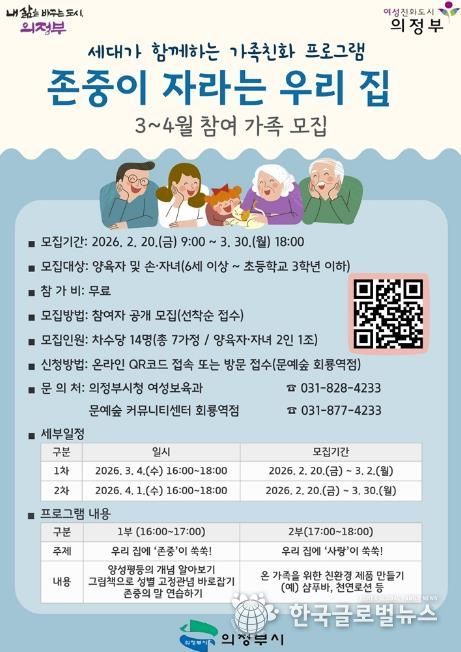 (한국글로벌뉴스 - 박소연 기자) 의정부시는 문예숲 커뮤니티센터 회룡역점(회룡역사 3층)에서 운영하는 ‘존중이 자라는 우리 집’ 프로그램 참여 가정을 2월 19일부터 선착순으로 모집한다.
