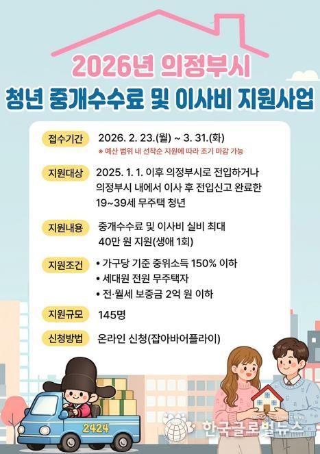 (한국글로벌뉴스 - 박소연 기자) 의정부시는 청년들의 주거 이전 비용 부담을 줄이기 위한 ‘2026년 청년 중개수수료 및 이사비 지원사업’의 신청자를 모집한다.