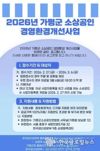 (한국글로벌뉴스 - 박소연 기자) 가평군은 관내 소상공인의 지속경영 기반을 강화하기 위해 ‘2026년 가평군 소상공인 경영환경개선사업’ 대상자를 3월 6일까지 모집한다고 밝혔다.