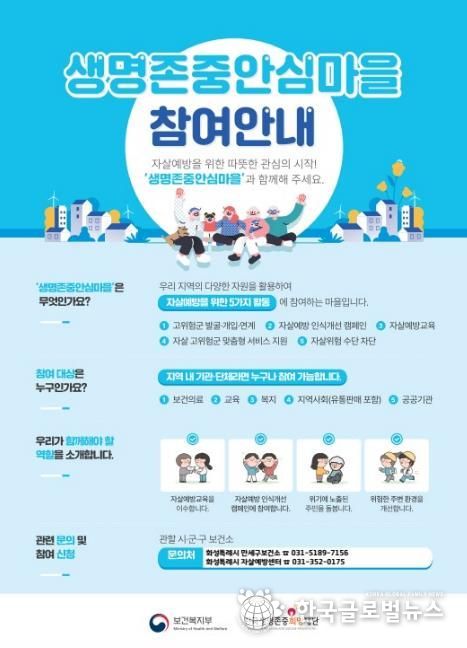 (한국글로벌뉴스 - 박소연 기자) 화성특례시가 자살 예방과 정신건강 증진을 위해 ‘생명존중 안심마을’을 확대 운영하고 사업에 함께할 지역사회 기관·단체를 모집한다고 밝혔다.
