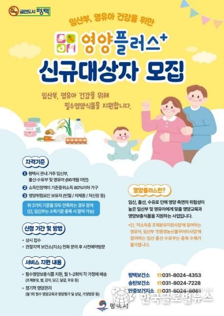 (한국글로벌뉴스 - 박소연 기자) 평택시는 영양 위험요인이 있는 임산부와 영유아의 건강증진을 위한 '2026년 영양플러스 사업’대상자를 모집한다고 밝혔다.