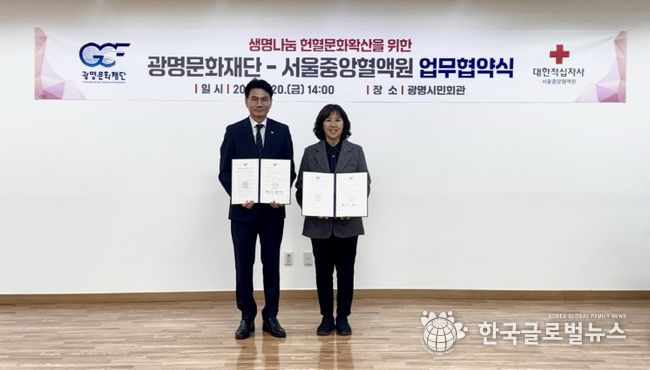 (한국글로벌뉴스 - 박소연 기자) (재)광명문화재단(대표이사 송은영)은 서울중앙혈액원(원장 이재용)과 함께 2월 20일 오후 2시에 광명시민회관에서 '헌혈자 대상 문화예술 프로그램 제공 및 헌혈 문화 정착을 위한 업무협약'을 체결했다고 밝혔다.