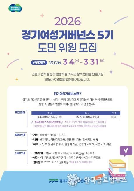 (한국글로벌뉴스 - 박소연 기자) 경기도여성비전센터가 2026년 ‘경기여성거버넌스’에서 활동할 도민위원을 오는 3월 31일까지 모집한다.
