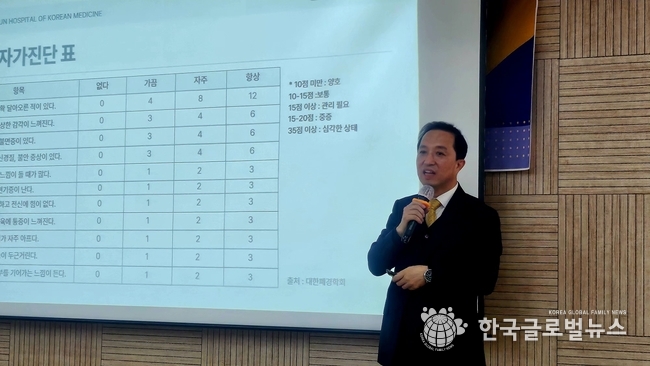 한편 '신년중년건강'에 관한 특강을 펼친 '수원본바른한방병원' 김 용 원장은."남성과 여성 모두 갱년기에서 벗어 날수 없다. 콩제품과 햇빛,운동을 병행하며 즐거운 생각과 건강한 삶을 추구하시길 바란다."며 건강의 의미를 강조하여 참석 회원들의 호응과 함께 총회를 마무리 했다.