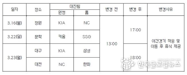 (한국글로벌뉴스 - 박지형 기자) 2026 KBO 시범경기 중 일부 경기의 개시 시간이 야간경기 적응 및 이동 후 휴식 제공을 위해 변경됐다.