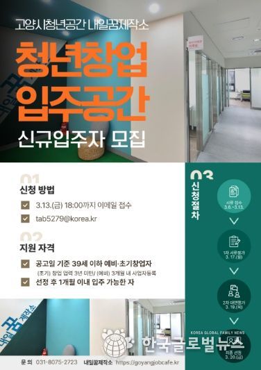 (한국글로벌뉴스 - 박종욱 기자) 고양특례시는 고양시 청년공간 내일꿈제작소 A동 2층에 조성된 청년창업 입주공간(3개소/7.4㎡~16.1㎡) 신규 입주자를 모집한다고 27일 밝혔다.