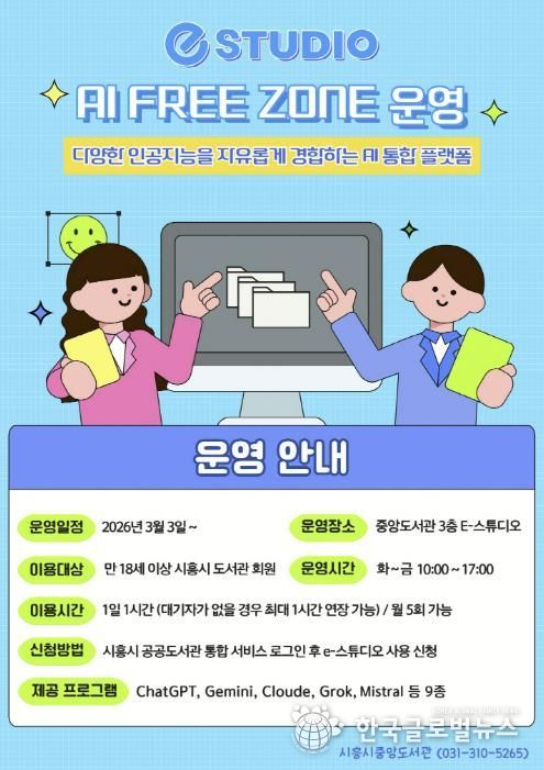 (한국글로벌뉴스 - 박소연 기자) 시흥시중앙도서관은 시민들의 인공지능(AI) 활용 역량 강화를 위해 시 정보통신과와 협업해 도서관 3층 e-스튜디오에 ‘인공지능(AI) 프리 존(Free Zone)’을 구축하고, 오는 3월 3일부터 본격 운영에 들어간다.