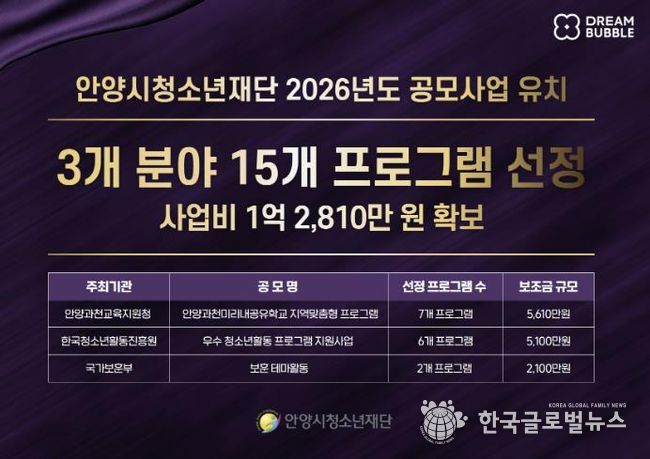 (한국글로벌뉴스 - 박소연 기자) 안양시청소년재단은 2026년 국가 및 공공기관, 교육청 등이 추진하는 주요 공모사업 3개 분야에서 15개 프로그램이 선정되어 총 1억 2,810만 원 규모의 사업비를 확보했다고 3일 밝혔다.